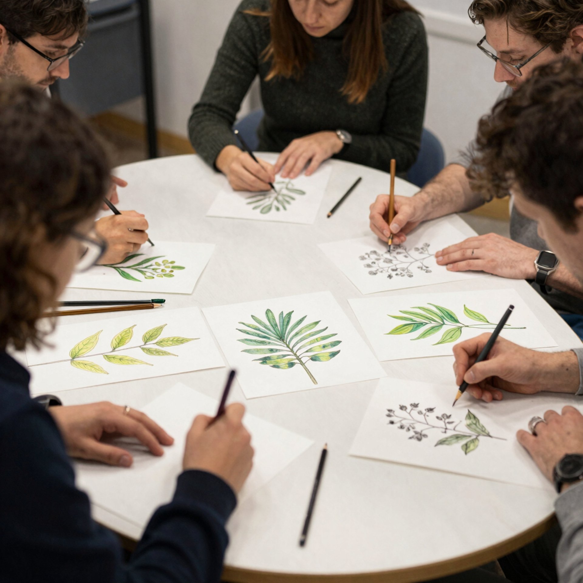 The botanical workshops have quickly become a favourite. Participants work from live specimens — seasonal flowers, herbs, leaves, and stems arranged in small vases on each desk. The focus is on observation: tracing the curl of a petal, mapping the network of veins on a leaf, capturing the particular green of a stem just cut from the garden. It's meditative, absorbing, and surprisingly joyful.